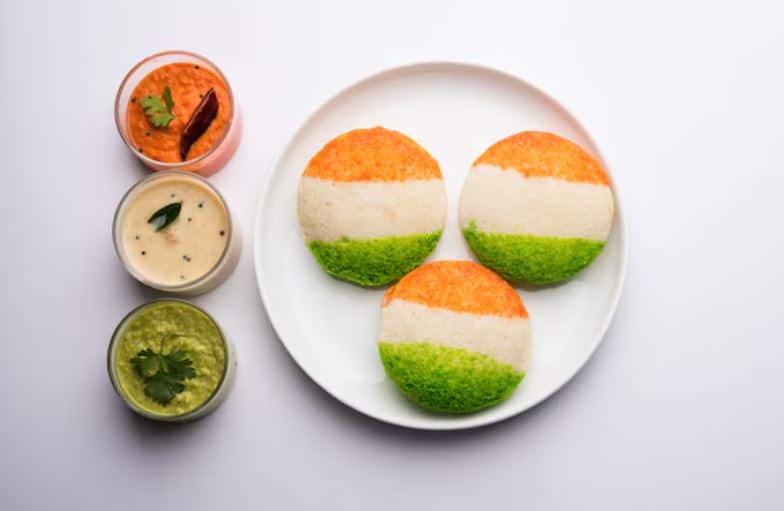 Divide your idli batter into three portions, mix one with carrot puree for saffron, keep one plain for white, and add spinach puree for green. Steam and pack with coconut chutney.